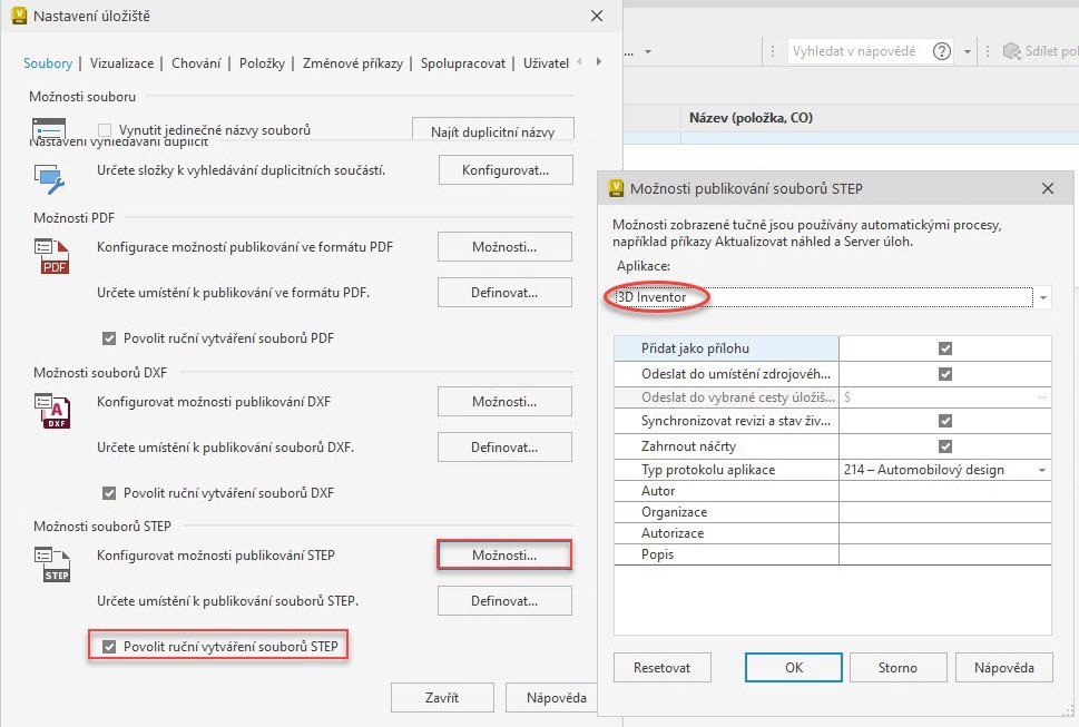 | Možnosti publikování souborů STEP aplikace Inventor | |