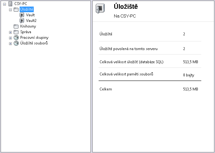 Zobrazí se přehled statistických dat o serveru úložiště. Ve statistikách je obsaženo: