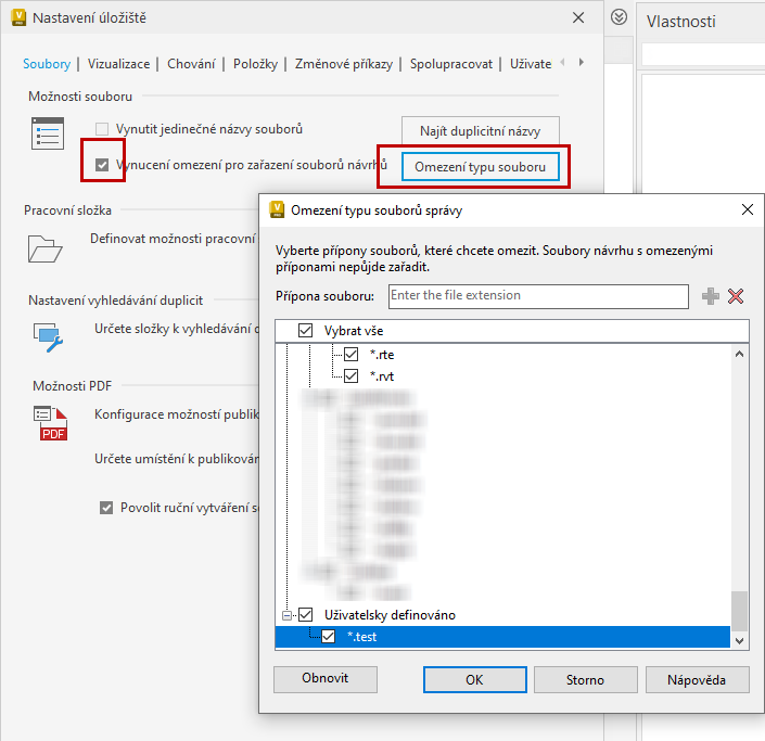 Jako správce můžete definovat seznam souborů návrhu, které se nemají zařazovat, když bude zapnuta možnost Vynucení omezení pro zařazení souborů návrhů. Do uživatelem definovaného seznamu můžete přidat vlastní přípony souborů, ale nemůžete odebrat výchozí přípony systému.
