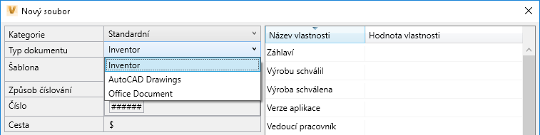 Výchozí dialog Nový soubor nástroje Data Standard obsahuje pole se seznamem Typ Dokumentu.