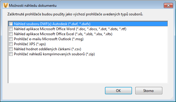 Určete výchozí nastavení pro prohlížení náhledů souborů aplikace Inventor, AutoCAD a dalších podporovaných typů souborů. Ve výchozím nastavení jsou soubory zobrazovány pomocí aplikace Autodesk Viewer. Vyberte výchozí nastavení prohlížení souborů: