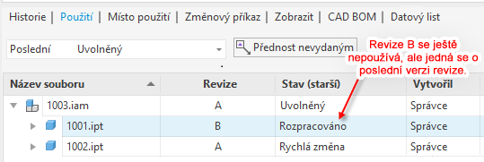 Nyní si ukážeme jednoduchý příklad, kdy je sestava v revizi A a součást v revizi B.