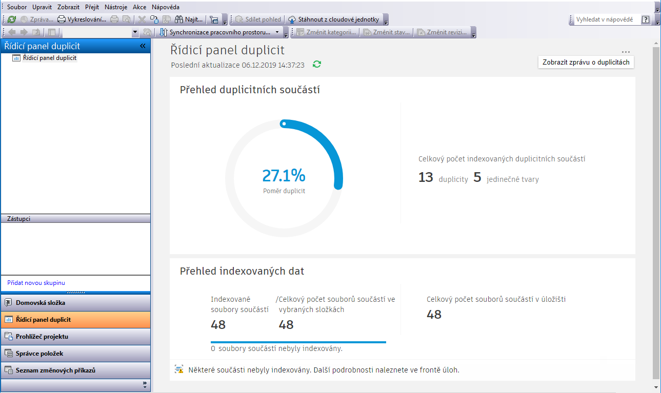 Pomocí tohoto řídicího panelu si můžete prohlédnout stav duplicitních a indexovaných součástí.