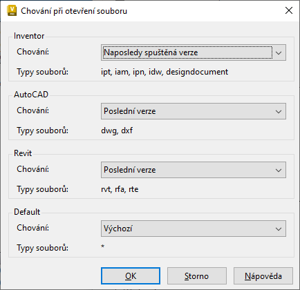 Umožňuje určit, zda se soubory aplikací Inventor, AutoCAD a Revit otevřou v poslední verzi, naposledy spuštěné verzi nebo verzi aplikace CAD, ve které byl soubor uložen.
