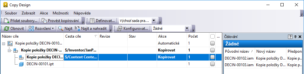 Pomocí tohoto pohledu můžete používat a přiřazovat jednotlivé akce kopírování k výkresům. Připojená akce je ve sloupci Akce označena hodnotou Automatické.