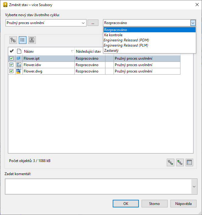 Klikněte na tlačítko OK. Nový stav se použije na vybrané objekty. Verze souboru se zvýší o jednu.