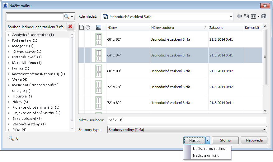 Funkce Načíst rodinu podporuje typy souborů RFA s katalogy typů nebo bez nich.