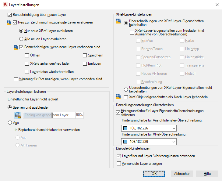 Gehen Sie folgendermaßen vor, um eine Benachrichtigung zu erhalten, wenn einer Zeichnung oder referenzierten XRef-Zeichnungen neue Layer hinzugefügt wurden.