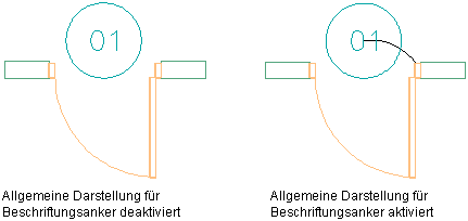 Die Verknüpfung zwischen dem Bauteilstempel und dem Objekt wird durch einen Bogen dargestellt. Beschriftung und Objekt werden von Einfügepunkt zu Einfügepunkt verbunden.