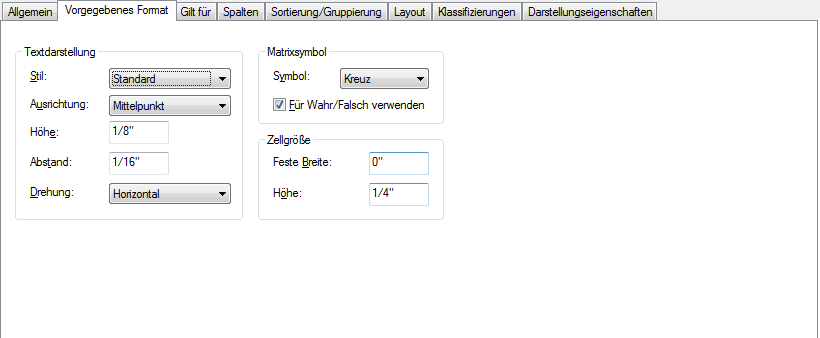 - Aktivieren oder deaktivieren Sie die Option Für Wahr/Falsch verwenden, um zu steuern, ob Matrixsymbole oder der Text im Eigenschaftsdatenformat für Wahr/Falsch-Werte verwendet werden.