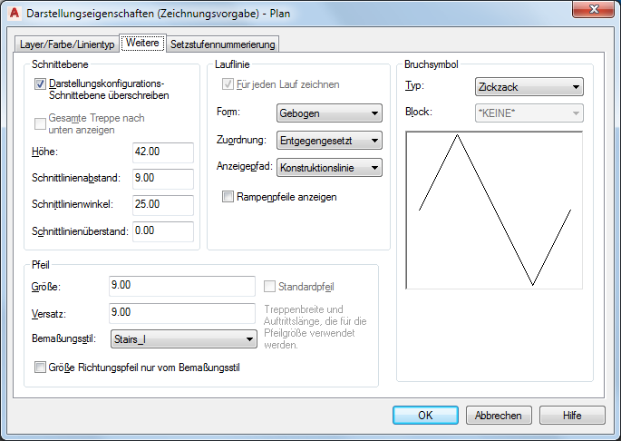 Gehen Sie wie folgt vor, um andere Darstellungseigenschaften einer einzelnen Treppe anzugeben, z. B. die Darstellung des Pfeils im Treppenpfad bzw. die Auswahl des Anzeigepfads sowie den Typ der in der Treppendarstellung verwendeten Bruchsymbole. Diese Darstellungseigenschaften betreffen lediglich Darstellungen, die wie z. B. die Plandarstellung eine Draufsicht einer Zeichnung verwenden.