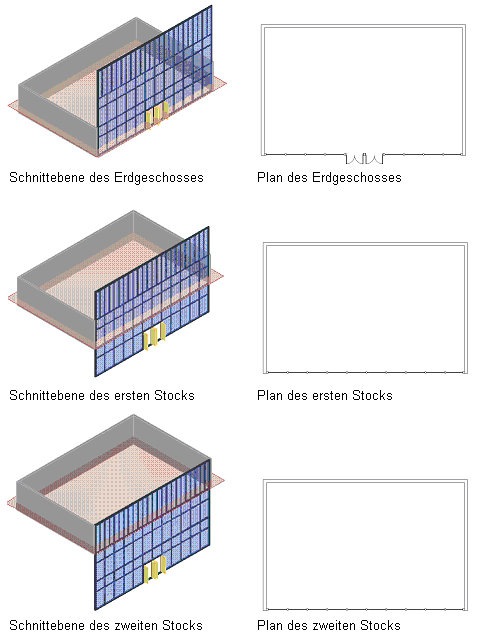 Die folgenden Abbildungen zeigen eine Fassade, die drei Geschosse überspannt. Die Bilder auf der linken Seite zeigen die Schnittebene der zugehörigen Geschosszeichnung an. Die Pläne auf der rechten Seite verdeutlichen, wie die Fassade in der Draufsicht auf die einzelnen Geschossen dargestellt würde. Beachten Sie das unterschiedliche Erscheinungsbild der Türen und Pfosten auf den verschiedenen Grundrissen.