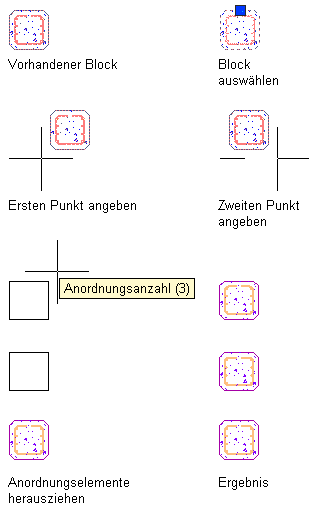 Gehen Sie wie folgt vor, um eine Anordnung von identischen Liniengrafiken (wie Schraffuren oder Polylinien), architektonischen Objekten (wie Türen oder Wände), AEC-Polygonen oder profilbasierten Objekten (wie Massenelementextrusionen oder Räume) zu erstellen. Außerdem können Sie beliebige blockbasierte Inhalte (z. B. Detailkomponenten) anordnen, die aus diesen Arten von Liniengrafiken oder Objekten bestehen.