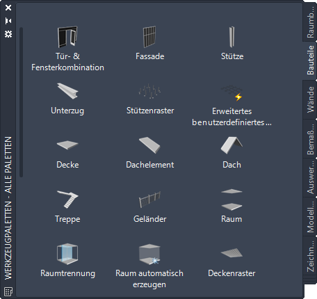 Vom CAD-Manager oder anderen Benutzern erstellte Werkzeugpaletten können ebenfalls Geländerwerkzeuge mit Geländerstilen und -eigenschaften enthalten, die für Ihre Projekte oder Anforderungen angepasst sind.