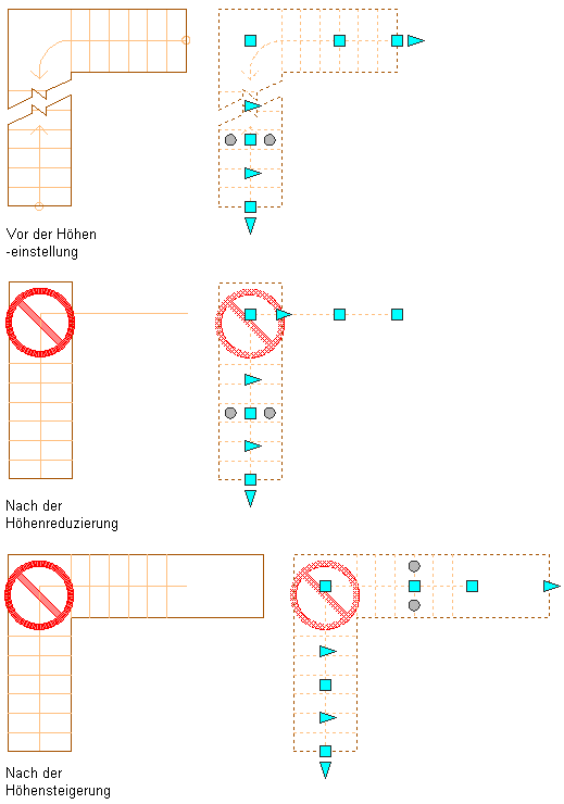 Folgende Abbildung zeigt einen geraden Treppen lauf mit deaktivierter Option StairFit vor und nach der Höhenänderung.