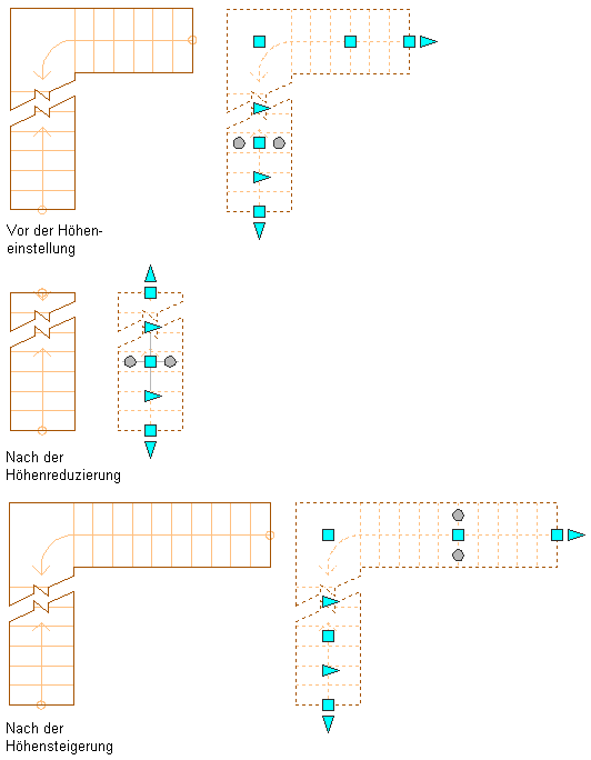 Folgende Abbildung zeigt einen geraden Treppen lauf mit aktivierter Option StairFit vor und nach der Höhenänderung.