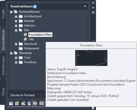 Im Projekt-Navigator können Sie Miniaturansichten von Projektzeichnungen anzeigen. Es kann eine Vorschaugrafik, eine Detailvorschau und einer Kombination aus beidem eingeblendet werden. Miniaturansichten können beim Navigieren in großen Projekten mit vielen Zeichnungen hilfreich sein.