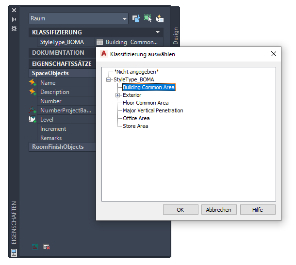 Wenn Sie beispielsweise den BOMA-Flächenberechnungsstandard für Ihre Zeichnung ausgewählt haben, wird die BOMA-Klassifizierungsdefinition angezeigt.