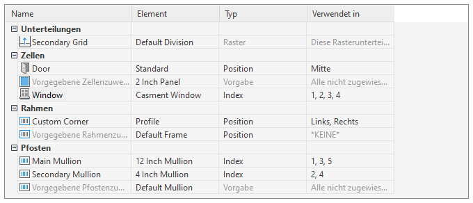 Nachdem Sie Elementdefinitionen für Fassadenstile erstellt haben, können Sie diese jedem Fassadenelementtyp zuweisen: Unterteilungen, Zellenfüllungen, Rahmen und Pfosten.