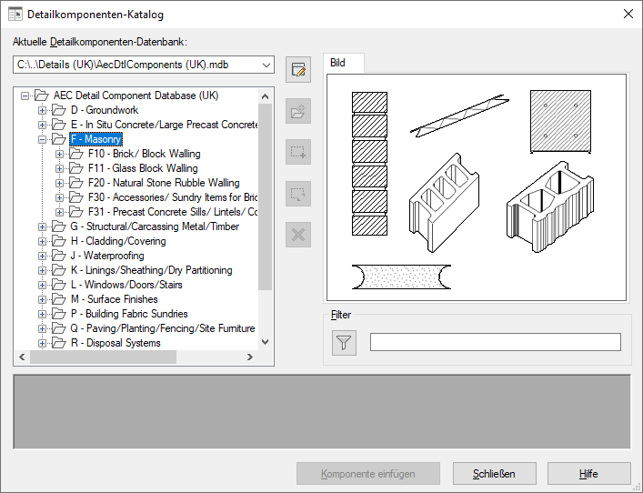 Im Dialogfeld Detailkomponenten-Katalog können Sie in verschiedenen Detailkomponenten-Datenbanken nach Komponenten suchen. Eine hierarchische Baumstruktur und eine Filterfunktion erleichtern die Suche nach einzelnen Komponenten in der Datenbank. Nachdem Sie eine entsprechende Komponente gefunden haben, können Sie sie in die Zeichnung einfügen oder durch Ziehen und Ablegen in eine Werkzeugpalette kopieren, wenn Sie sie häufig verwenden möchten. Beachten Sie, dass die fünf vertikal in der Mitte des Dialogfelds angeordneten Schaltflächen nur zur Verfügung stehen, wenn Sie Bearbeitungsrechte für die ausgewählte Datenbank haben.
