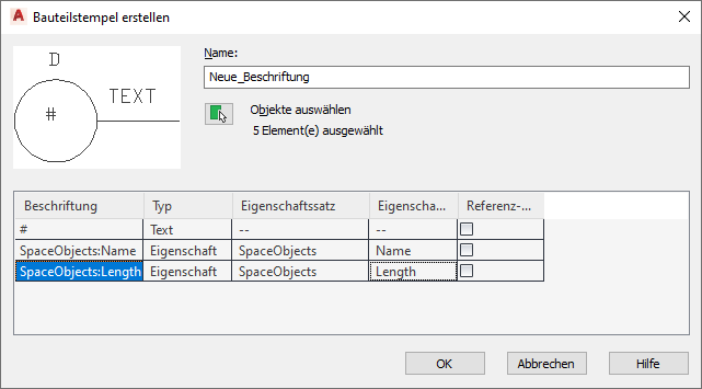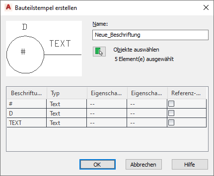 | Erstellen eines Bauteilstempels aus einer vorhandenen Beschriftung | Klicken Sie auf ![]() . ![]() ![]() . |