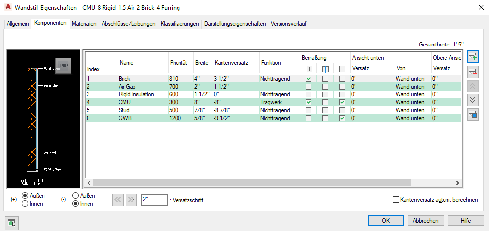 Über die Registerkarte Komponenten im Dialogfeld Wandstile können Sie Wandkomponenten wie von Ihnen festgelegt anzeigen lassen.