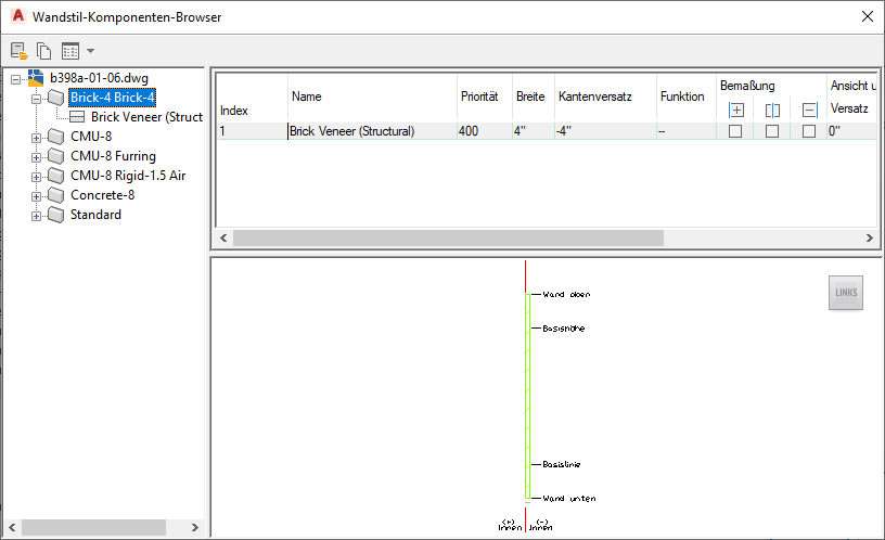 Der Wandstil-Komponenten-Browser ist ein Dienstprogramm, mit dem Sie Wandkomponenten aus Wandstilen in die aktuelle Zeichnung sowie in andere Zeichnungen kopieren und dort anzeigen können. Sie können Komponenten aus diesen Stilen in den aktuellen Wandstil kopieren. Nachdem Sie sie dem Wandstil hinzugefügt haben, können Sie ihre Eigenschaften so ändern, wie dies für den Stil notwendig ist, der zurzeit bearbeitet wird.