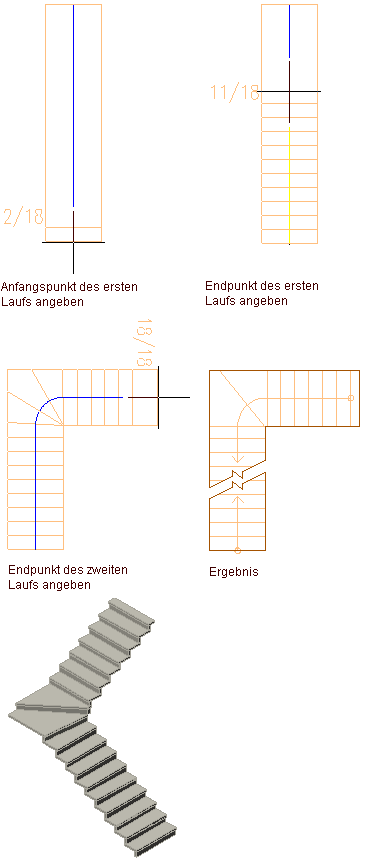 Anmerkung: Ist für den Treppenstil die Option Podeste verlängern, um zu verhindern, dass Steigungen und Auftritte darunter liegen aktiviert, wird der Treppenlauf nicht genau um das Treppenende gedreht.