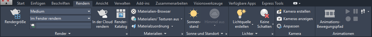 Diese Registerkarte enthält alle Befehle zum Rendern sowie für Materialien, Beleuchtung, Kameras und Animationen.