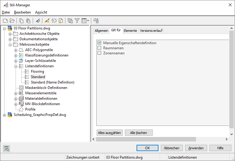 Anmerkung: Listendefinitionen können auch für Raum- und Zonennamen erstellt werden.