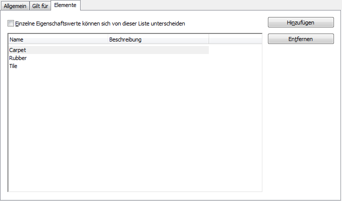 - Sollen andere Werte als die hier festgelegten auf der Eigenschaftenpalette angezeigt werden, wählen Sie die Option Einzelne Eigenschaftswerte können sich von dieser Liste unterscheiden.