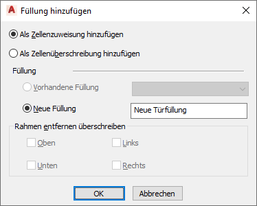Als Zellenüberschreibung hinzufügen, wobei Sie eine Tür oder ein Fenster mit einem anderen als dem in der Zeichnung vorhandenen Stil einfügen und eine Kante des Rahmens entfernen möchten, der das Objekt umgibt. Wählen Sie Neue Füllung, und geben Sie einen Objektnamen ein. Wählen Sie für Rahmen entfernen überschreiben eine der Optionen Oben, Unten, Links oder Rechts, und klicken Sie auf OK.