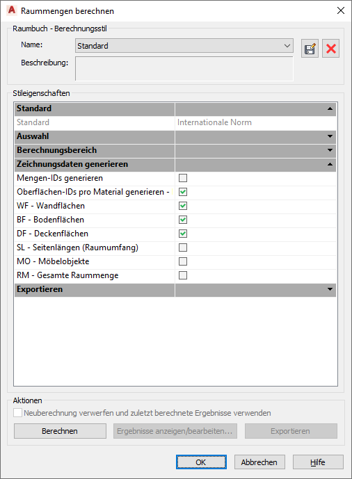 - Wählen Sie im Dialogfeld Raummengen berechnen unter Stileigenschaften in der Liste Zeichnungsdaten generieren die Option Oberflächen-IDs pro Material generieren aus.