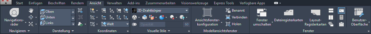 - Darstellung: Hier können Sie die vordefinierten Ansichten auswählen, neue Ansichten erstellen, den Ansichts-Manager öffnen, einen visuellen Stil auswählen und 2D- und 3D-Navigationseinstellungen festlegen. Sie haben Zugriff auf vordefinierte Anzeigethemen. Außerdem können Sie Zuschneideebenen anpassen und die Befehle zum Neugenerieren aufrufen.