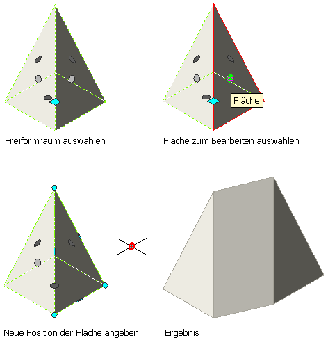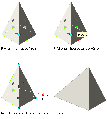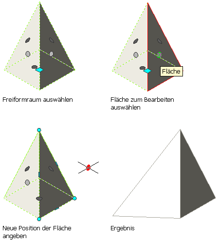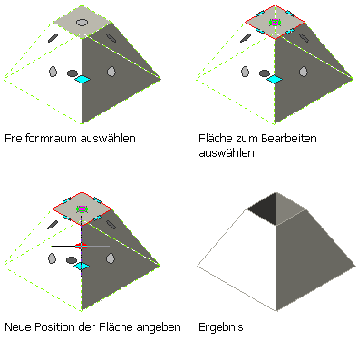 | Freies Verschieben der Raumfläche, während angrenzende Oberflächen gestreckt werden | Klicken Sie auf den Oberflächengriff, halten Sie die Maustaste gedrückt, drücken Sie einmal STRG, und geben Sie die neue Position an. |