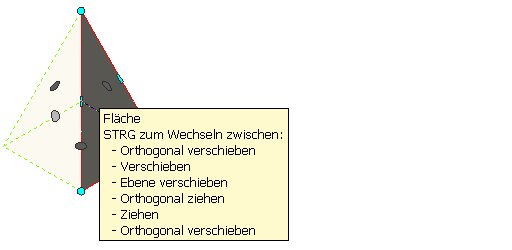 | Orthogonales Ziehen der Raumfläche, während angrenzende Oberflächen hinzugefügt werden | Klicken Sie auf den Oberflächengriff, halten Sie die Maustaste gedrückt, drücken Sie dreimal STRG, und geben Sie die neue Position an. |