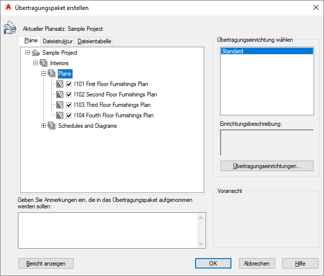 Bei der elektronischen Übertragung können Sie die Zeichnung in elektronischer Form als Paket übermitteln. Die Zeichnungsdateien im Übertragungspaket enthalten automatisch auch alle relevanten Zusatzdateien wie externe Referenzen und Schriftartendateien.
