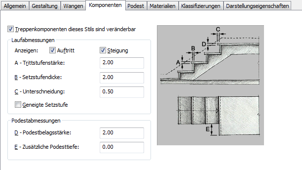 Anmerkung: Ist die Option Treppenkomponenten dieses Stils sind veränderbar aktiviert, wirken sich Änderungen auf dieser Registerkarte nicht auf vorhandene Stufen aus. Damit diese Treppen mit den Stileinstellungen übereinstimmen, wählen Sie die Treppe aus, zeigen die zugehörigen Eigenschaften sowie das Komponenten-Arbeitsblatt an und klicken auf Auf Stilwerte zurücksetzen.