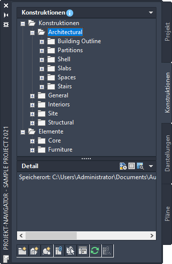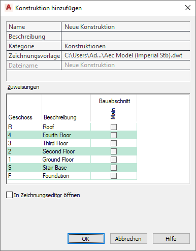 | Benennen der neuen Konstruktion | Geben Sie einen Namen ein. Bei Verwendung der Projektnummer als Präfix für Projektdateinamen ist es nicht nötig, hier ein Präfix einzugeben. Der vollständige Name mit Präfix wird unter Dateiname angezeigt. |