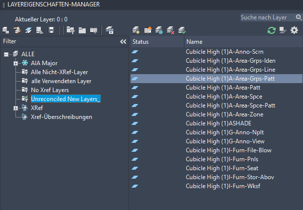 Wenn Sie auf den Link klicken, wird der Layereigenschaften-Manager geöffnet, und der Filter für nicht abgestimmte neue Layer ist automatisch ausgewählt. Alle neuen Layer, die der Zeichnung oder den angehängten externen Referenzen hinzugefügt wurden, werden in der Listenansicht angezeigt.