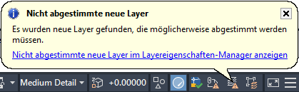 Wenn die Benachrichtigung aktiviert ist, wird eine Benachrichtigung über neuen Layer in Form einer Sprechblase auf der Statusleiste angezeigt, sobald eine der festgelegten Aktionen ausgeführt wird. Bei diesem Vorgang werden neue Layer erkannt. Sie können die neuen Layer anzeigen, indem Sie auf die Verknüpfung Nicht abgestimmte neue Layer anzeigen klicken.