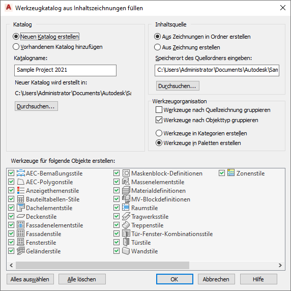 Anmerkung: Wenn beide Optionen aktiviert wurden, wird die Zeichnung zunächst nach den Zeichnungen und anschließend nach dem Objekttyp gruppiert, sodass Kategorien aus den Zeichnungen und Paletten aus den Objekttypen erstellt werden. Dies ist fest vorgegeben, da Paletten nicht verschachtelt werden können. Die Optionsfelder für Kategorien und Paletten stehen dann nicht zur Verfügung, und die Option Werkzeuge in Paletten erstellen ist automatisch ausgewählt.