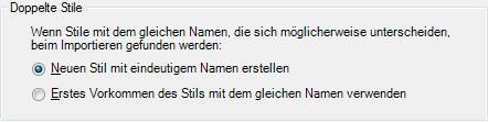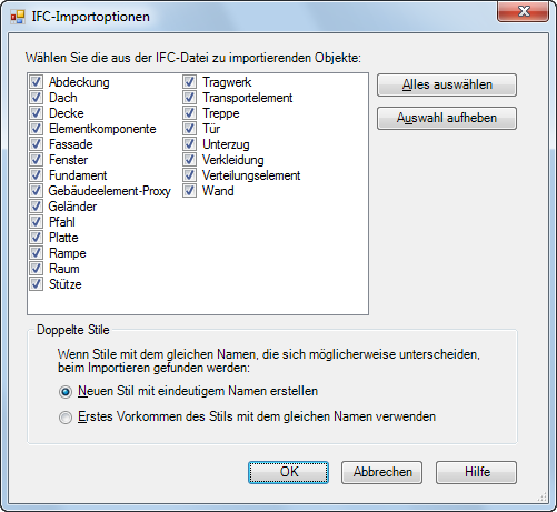 Sie können angeben, wie und wann Stile erstellt werden, wenn mehrere Stile mit demselben Namen in der IFC-Datei vorhanden sind. Beim Importieren kann ihnen entweder ein inkrementell erhöhtes Zahlensuffix angehängt werden, oder es kann das erste Vorkommen des Stils mit dem gleichen Namen verwendet werden, unabhängig davon, ob die Stile identisch sind.