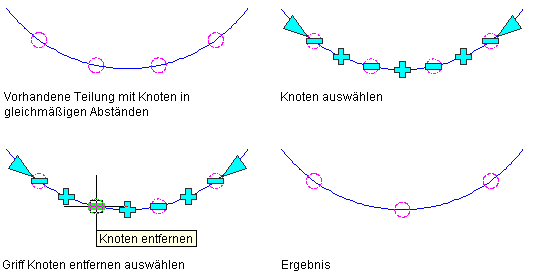 - Wenn Sie einen Knoten aus einer Teilung mit gleichmäßig verteilten Knoten entfernt haben, wird der neue Knoten an der angegebenen Position entfernt und die Position der übrigen Knoten wird neu berechnet, sodass sie weiterhin gleichmäßig verteilt sind.