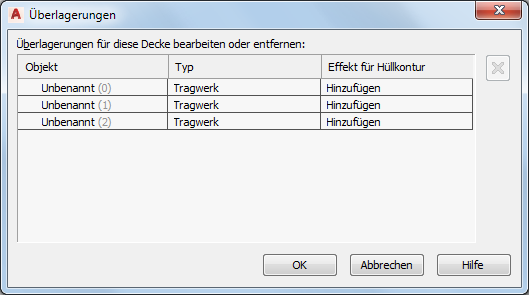 Anmerkung: In diesem Arbeitsblatt können Sie Überlagerungen auch entfernen, indem Sie mit der rechten Maustaste auf den Wert Objekt oder Typ klicken, und Entfernen wählen. Alternativ können Sie die kontextabhängige Registerkarte der Decke oder des Dachelements verwenden, wie unter So entfernen Sie Überlagerungen von einer Decke oder einem Dachelement beschrieben. Beim Entfernen einer Überlagerung wird auch die Assoziation zwischen der Decke bzw. dem Dachelement und dem Objekt entfernt, das zum Erstellen der Überlagerung verwendet wurde. Das Objekt selbst wird nicht aus der Zeichnung entfernt.