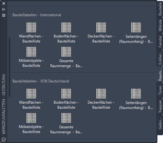 Die Werkzeugpalette Raumbuch enthält je nach aktuellem Berechnungsstandard unterschiedliche Bauteiltabellen. Die Befehle sind mit der Datei