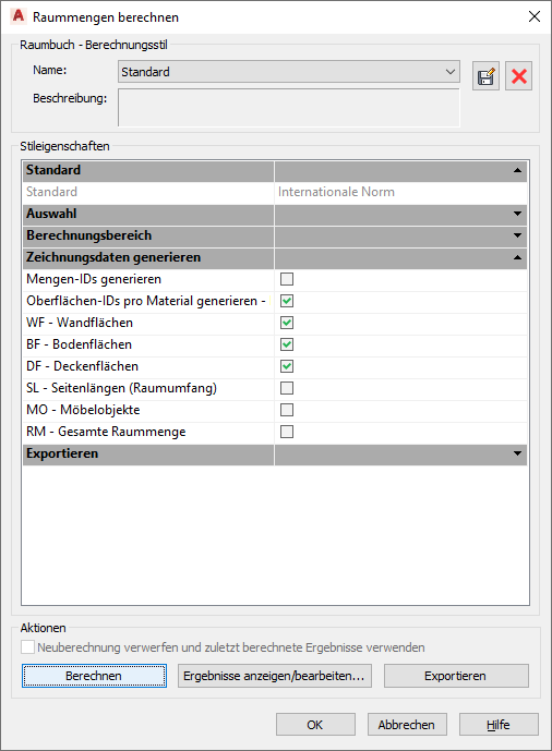 - Wählen Sie im Dialogfeld Raummengen berechnen unter Stileigenschaften in der Liste Zeichnungsdaten generieren die Option Oberflächen-IDs pro Material generieren aus.