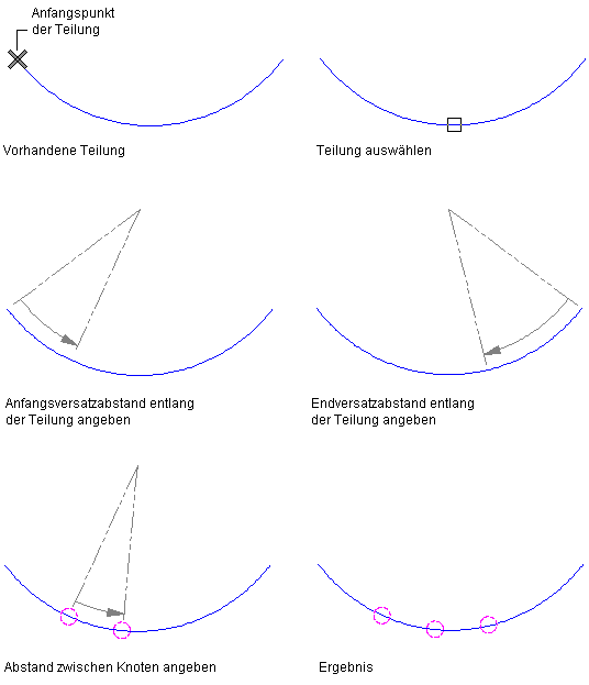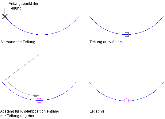 Platzieren von Knoten an von Ihnen angegebenen Positionen Drücken Sie die EINGABETASTE. Geben Sie die Anzahl an Knoten ein, und legen Sie die Knotenpositionen fest, indem Sie diese wählen oder den Abstand vom Anfangspunkt der Kurve eingeben.