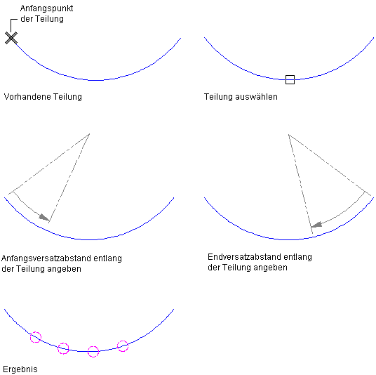 Verteilen einer festen Knotenanzahl entlang der Kurve Geben Sie g (Gleichmäßig anordnen) ein. Geben Sie den Anfangs- und Endversatz des ersten und letzten Knotens sowie die Knotenanzahl an.