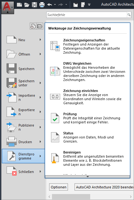 Der Menü-Browser enthält grundlegende Befehle für die gesamte Zeichnung. Dazu gehören Öffnen, Speichern, Drucken und Exportieren. Wie dem Menü-Browser öffnen Sie das Anwendungsmenü durch Klicken auf